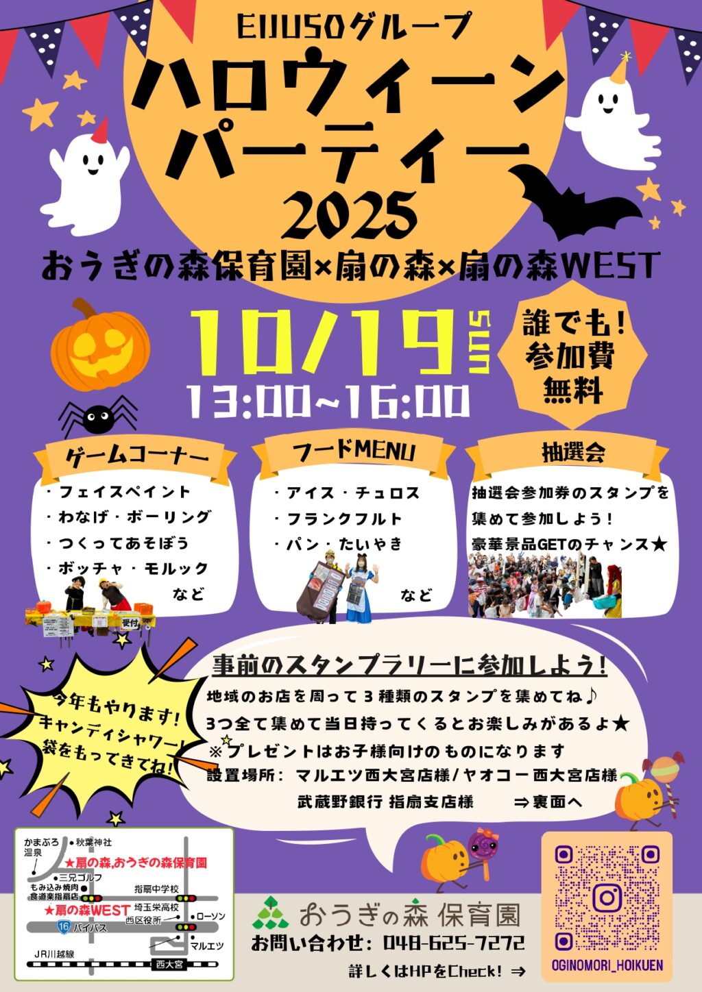 今年のEIJUSO ハロウィンパーティー!はエリアごとに分かれて開催します! お近くの会場までGO!GO! ※エリアごとに日程・時間が異なりますのでお気を付けください。 〇さいたま市西区 特養扇の森×特養扇の森WEST×おうぎの森保育園 日程:10月28日(土)14:30~17:30 〇さいたま市北区 特養今羽の森×こんばの森保育園 日程:10月28日(土)13:00~15:00 〇上尾市 特養ご福あげお×つつじが丘認定こども園 日程:10月27日(金)16:00~18:00 〇東京都板橋区 さいわい保育園×大山西町保育園 日程:10月28日(土)9:30~12:00