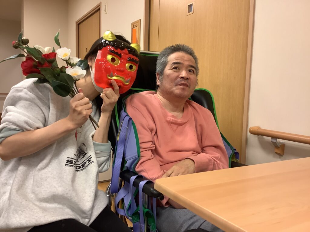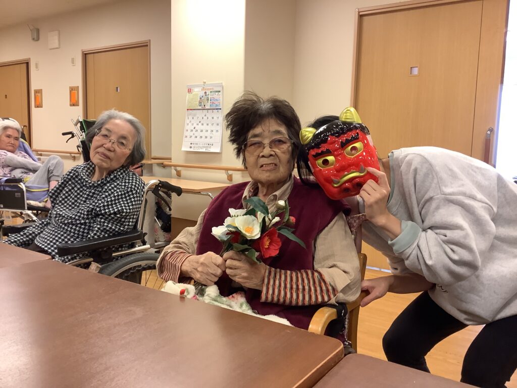 ユニットスタッフが鬼のお面を被りハイチーズ