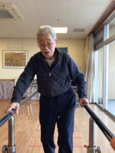 こちらの入居者様は平行棒の間を歩行するリハビリ中です![]()