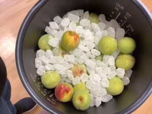 炊飯器に氷砂糖と梅をいれてスイッチオン