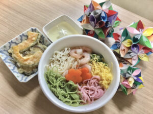 お昼ご飯は七夕そうめん・ナスとかぼちゃの天ぷら・レモネードゼリーでした