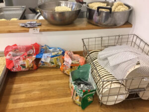 支援品のサンフレッセ伊奈工場様からのパンのご支援、その他の支援品もあり、配布させていただきました