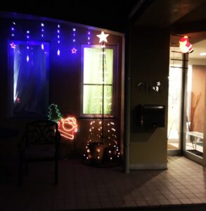 室内はツリーやクリスマスオーナメントで装飾、外にイルミネーションを設置しています