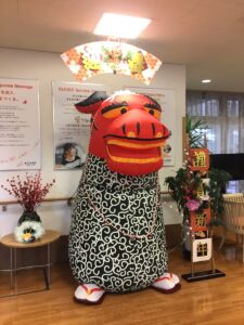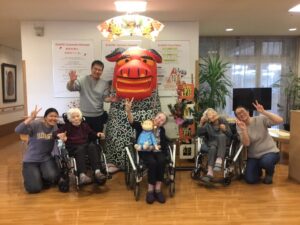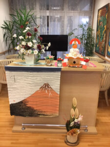 こんにちは生活相談員の上原と申します 今羽の森もお正月をお迎えする飾りつけをいたしました ご入居者様もお散歩にいらしたので記念撮影をいたしました