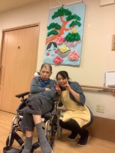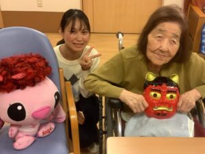 入居者様と一緒に作った節分の壁飾りと一緒に