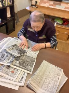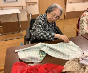 新聞紙たたみや洗濯物たたみはお手伝いや役割の維持といった部分も含みますが、手先のリハビリにもなっています