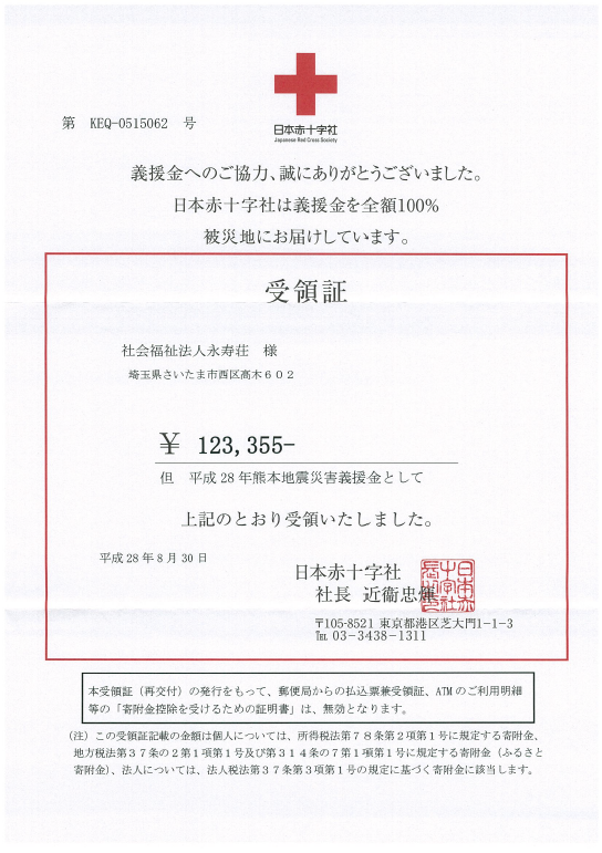 7月23日に行われた 『第13回扇祭り』 にて売り上げの一部を熊本地震災害義援金として日本赤十字社様に寄付させていただきました