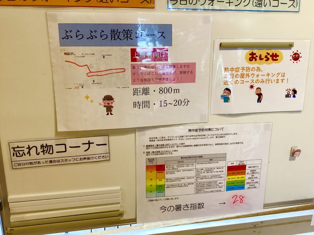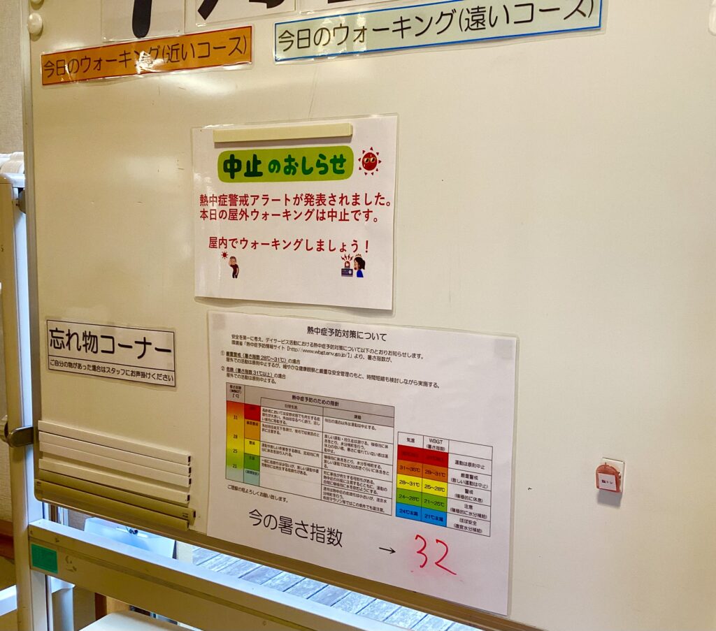 扇の森では暑さ指数などをもとに屋外ウォーキングの実施やコースを判断しており、ご利用者様にも分かりやすいように廊下へ掲示も行っております💡