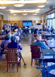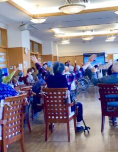 前方では座って行える体操の映像を流し、行っていただいております💪